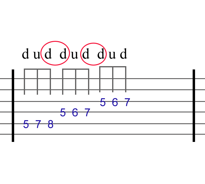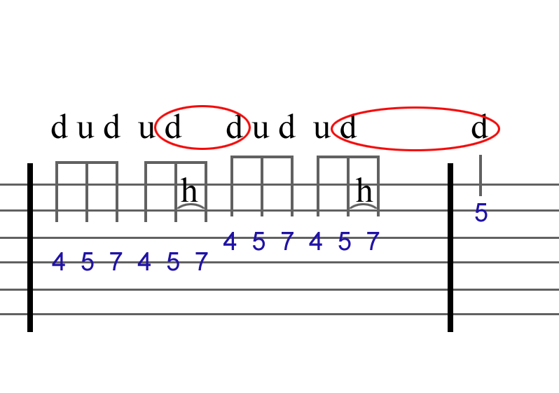 I’ve also heard of players simply altering scale patterns with additional notes (likely passing or chromatic) to have the “correct” number of notes. (Frank Gambale does this apparently.) The first diagram shows part of a standard pentatonic ascending scale (D minor) with two notes per string. It’s followed with a tab of that pattern “adjusted” to be more conducive to economy picking (which in this case would require an odd number of notes per string.)