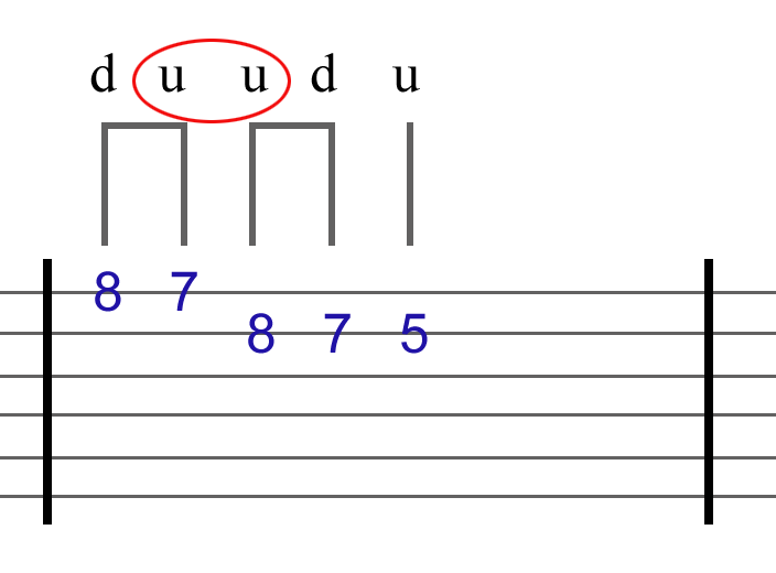 There are other situations where an upstroke will point you in the right direction of the next target note and thus economy picking would advise hit two notes in a row (on separate strings) with an upstroke. (See tab below.)