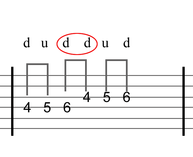 There’s a guy named Troy Grady who has done an extensive series of videos (not all free) looking at the topic of picking. (I definitely recommend taking a look at the free ones, at least.) He makes some interesting points about economy picking. To look at one example, let’s consider a situation where you are going up a scale. If you are doing three notes per string and starting on a downstroke, economy picking works great. You’ll end each of the three note groups on a downstroke that will take you right onto the next string. But what if you’re doing a 2 or 4 or 6 notes per string pattern? Now the advantage of economy picking is lost because you are ending on an upstroke, moving away from your next string. Check it out.