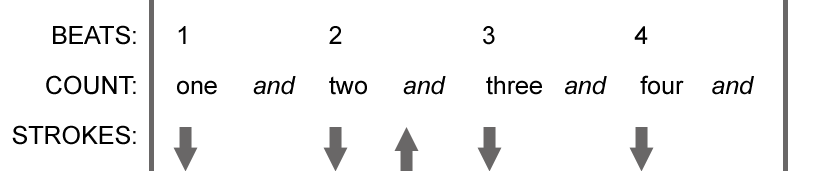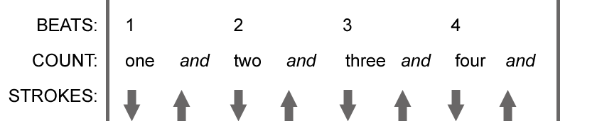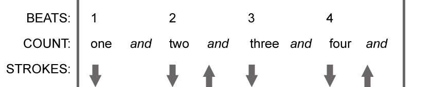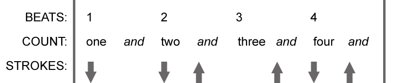 Each beat of a measure can be divided in half. Often this will be counted as “one and, two and, three and, four and etc.” You can hit the “and” beats, usually called off beats, by strumming upward with an upstroke, bringing your strumming hand to its original position. Here’s an example in 4/4 time that hits all the down beats with a downstroke and hits the off beats of beats two and four with upstrokes.