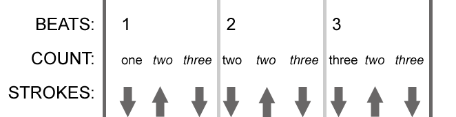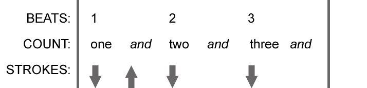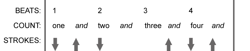 You can also mix and match these two techniques. The key thing is to use downstrokes for the downbeats and up strokes for the off beats (or, as they are sometimes called, up beats.)